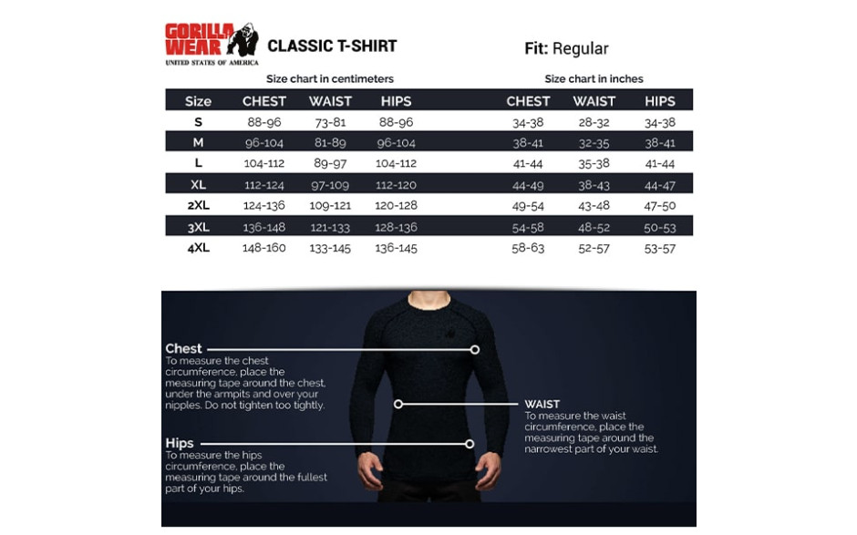 Durch die normale Passform (Regular fit) ist das T-Shirt weder zu eng noch zu weit, sodass es sich an deine Körperkonturen anpasst. Er besteht außerdem zu 100 % aus Baumwolle, weshalb das Shirt wunderbar weich ist und sich auch nach mehrmaligem Waschen noch so anfühlt. Wenn du dir in puncto T-Shirts noch etwas mehr Abwechslung wünschst, lässt sich die Anzahl der T-Shirts problemlos steigern: Das Classic T-Shirt von Gorilla Wear gibt es nämlich noch in weiteren stylishen Farben.